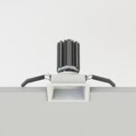 Apparecchi da incasso a sezione quadrata fisso con posizione lampada arretrata antiabbagliamento. Disponibili con battuta o in versione incasso rasato. Corpo ottico realizzato in pressofusione di alluminio, ottica in finitura alluminio 99,9%. Grado di protezione IP20/IP23.
