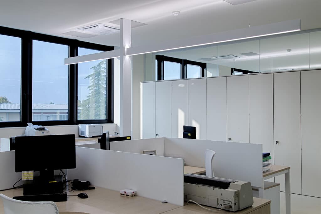 Sistema modulare per illuminazione diretta e indiretta, diffusa e/o d’accento, composto da profili vuoti in estruso di alluminio verniciato o anodizzato 120×40 mm. di lunghezza predefinita o tagliabili a misura, disponibili nelle versioni a parete e sospensione. Da integrare con sorgenti lineari LED, reglettes per lampade fluorescenti T16 e moduli binario max 16A 3 accensioni per inserimento di proiettori. Reglettes fluorescenti complete di alimentazione elettronica 50/60Hz 230/240V. Reglette LED con driver integrati. Da completare con le testate di chiusura laterali con sistema Light Proof, schermo diffondente in PC opalino bianco o microprismatico (conforme normativa EN 12464-1), profili di chiusura, di lunghezza predefinita o tagliabili a misura, o griglia dark-light in alluminio ad alta specularità e staffe di fissaggio o cavi di sospensione. Grado di protezione IP20 o IP40.