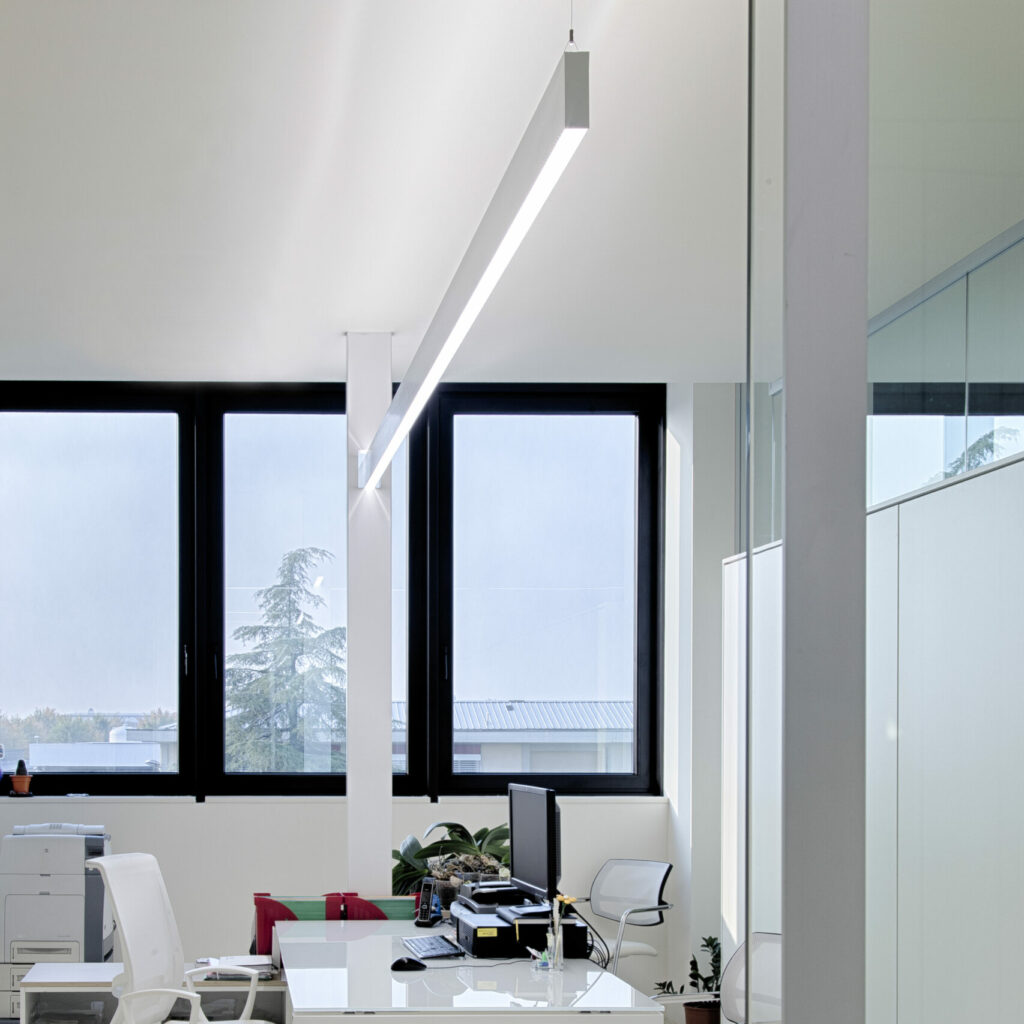 Profili in estruso di alluminio mono e bi-emissione 120x40mm, per installazione a parete, sospensione e soffitto, con sorgenti lineari led ed alimentatori elettronici integrati 230/240V. Finitura verniciata o anodizzata. Schermi diffondenti in policarbonato opalino o microprismatico, a luminanza controllata (conforme normativa EN12464-1) e testate di chiusura laterali con sistema Light Proof. Grado di protezione IP20/IP40.