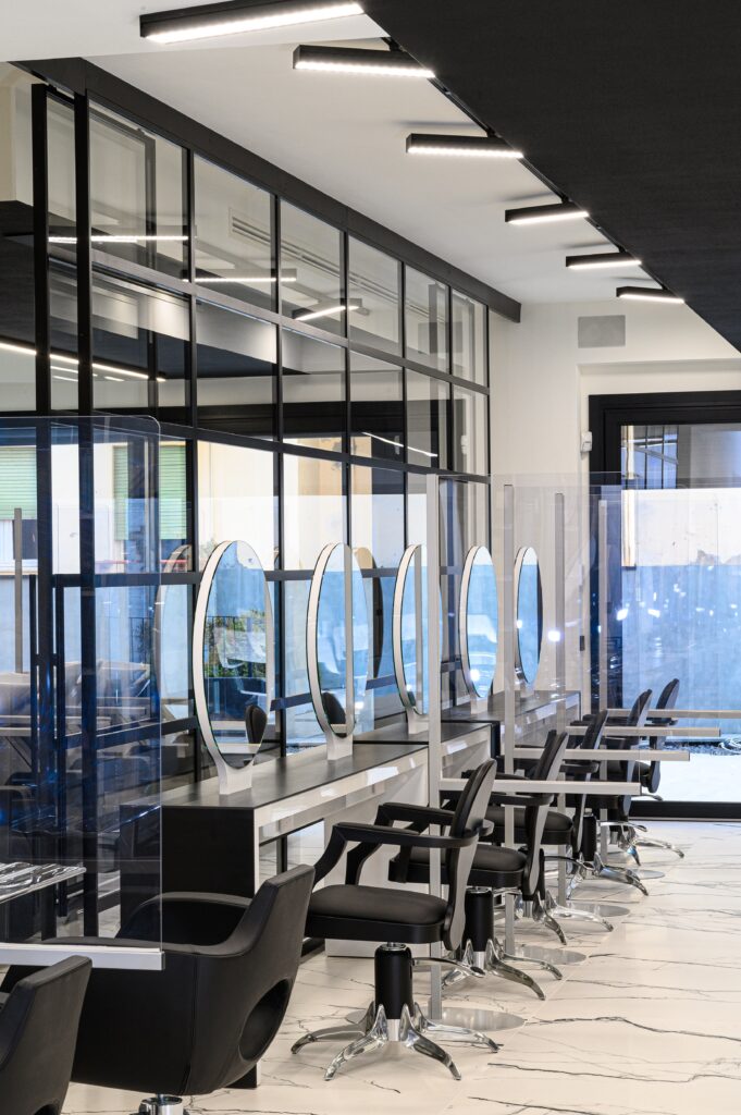 Sistema modulare, in estruso di alluminio 98x48mm, a sospensione o su binario trifase elettrificato da completare con gli accessori dedicati necessari. Finitura verniciata testurizzata. Schermi per luce diffusa in policarbonato opalino, ottiche professionali con diverse aperture del fascio ed equipaggiabile, all’occorrenza, con pannelli fonoassorbenti in diversi colori e materiali. Grado di protezione IP40