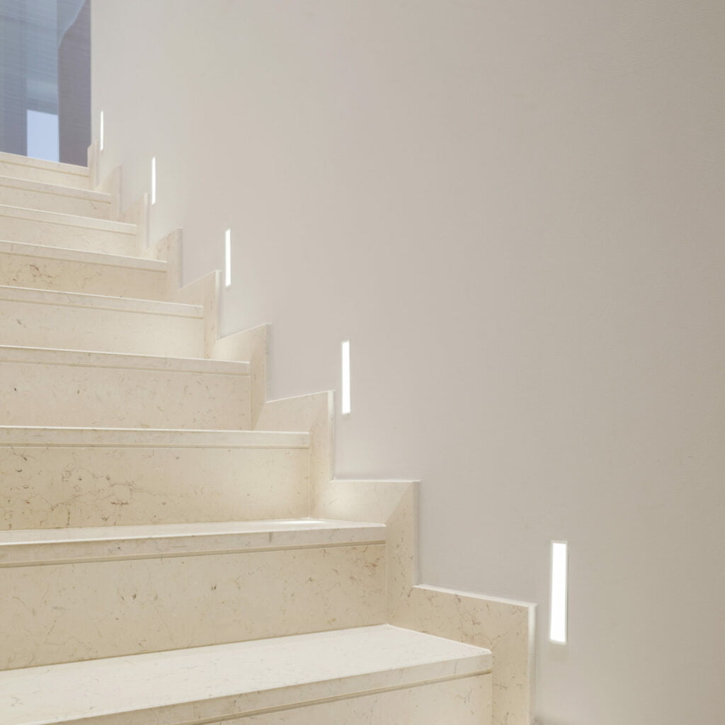 Apparecchio da incasso a parete per illuminazione segnapasso direzionata con angolo di 20°, per sorgente LED integrata con alimentazione remota disponibile come accessorio. Corpo e cornice di battuta in metallo verniciato. Installabile anche in pareti e soffitti in calcestruzzo mediante apposita cassaforma in lamiera zincata disponibile come accessorio. Grado di protezione IP20.
