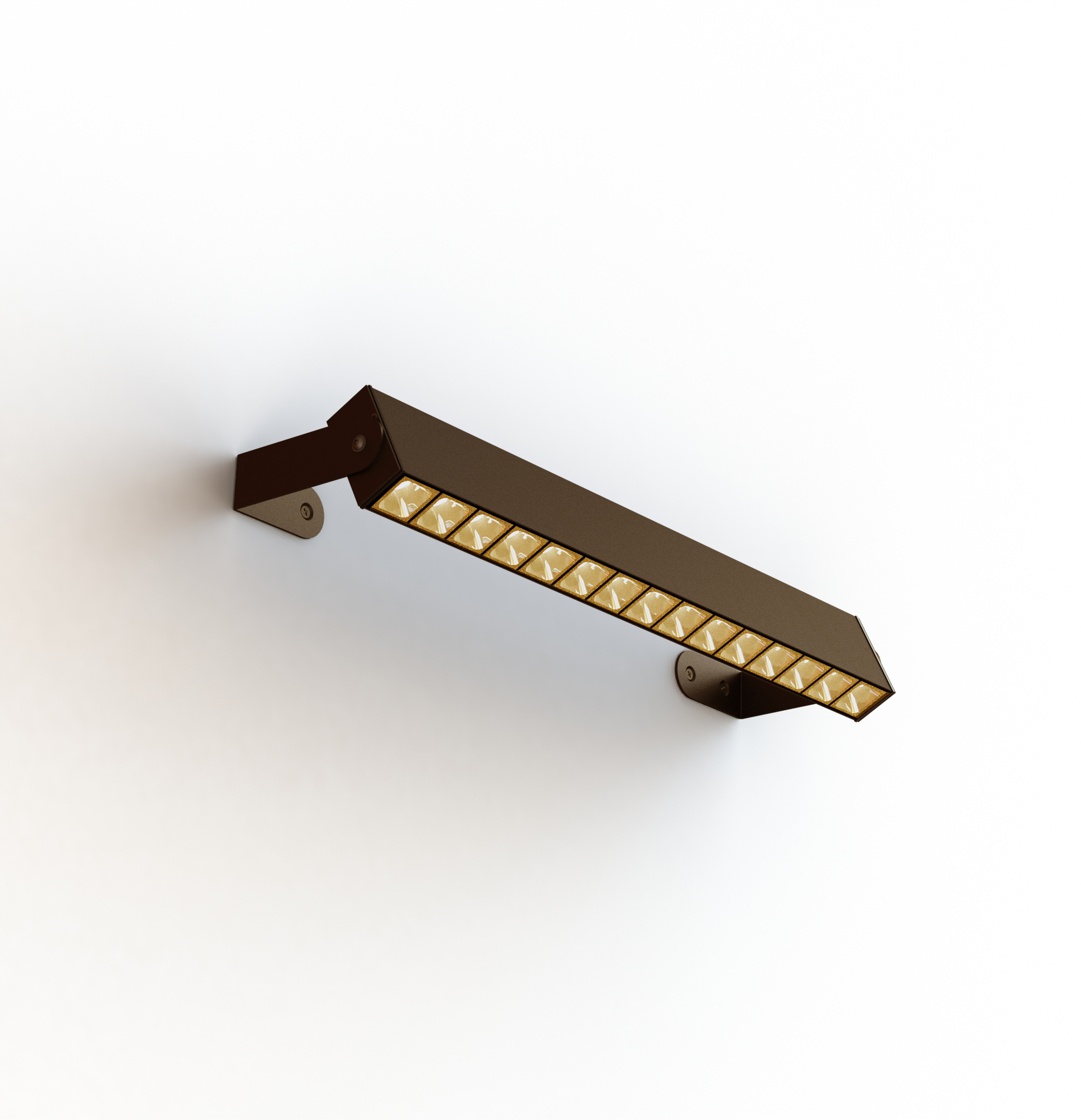 Apparecchio da esterno di misura 470 mm. E’ costituito da un profilo di estruso di alluminio rettangolare, corpo dell’apparecchio, al cui interno sono alloggiati in fila di 15 gruppi ottici – composti di LED professionale chip on board 2,2W , lente e housing antiabbagliamento UGR<14 - permettendo quindi di raggiungere flussi luminosi molto elevati. Ottiche spot, flood, wide e Asymmetric.… leggi tutto