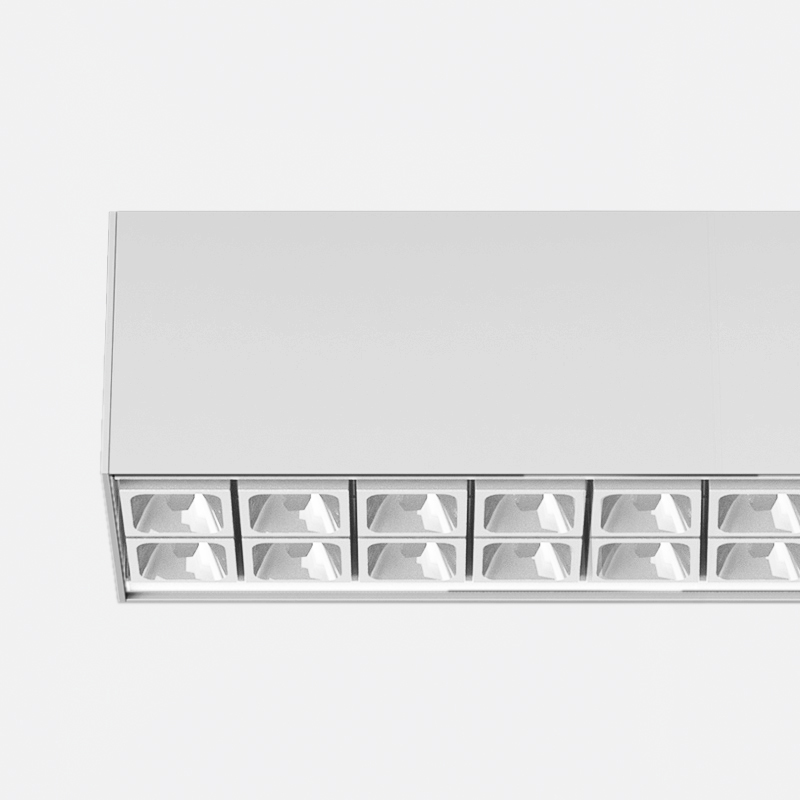 Proiettore compatto indoor da parete/soffitto costituito da un profilo in estruso di alluminio rettangolare, all'interno del corpo dell’apparecchio sono alloggiati in fila una serie di gruppi ottici da 10+10 led chip on board, lente e housing antiabbagliamento UGR<14. Grado di protezione IP20.