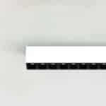 Proiettore compatto indoor da parete/soffitto costituito da un profilo in estruso di alluminio rettangolare, all'interno del corpo dell’apparecchio sono alloggiati in fila una serie di gruppi ottici da 15 led chip on board, lente e housing antiabbagliamento UGR<14. Grado di protezione IP20.
