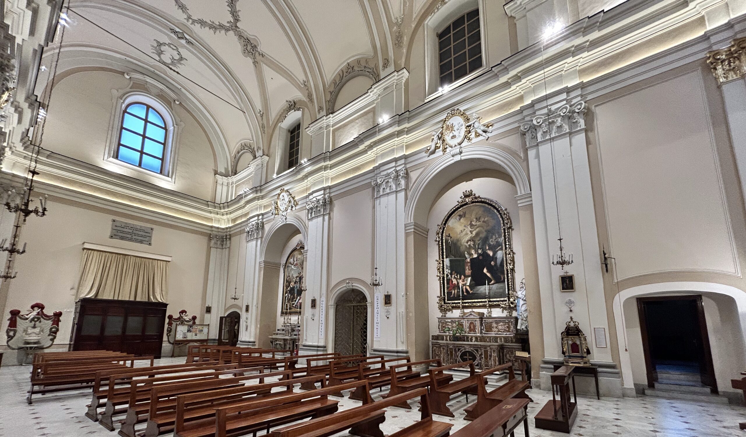Il proiettore da appoggio o da parete discreto, ma potente ideale per cornicioni. Corona permette di direzionare la luce dove serve. Illumina con eleganza e discrezione. Disponibile in tre finiture di colore: bianco, nero o bronzo. Per l’illuminazione delle navate sono stati scelti proiettori a luce bianca e ottica 40° posizionati in corrispondenza della semicolonne della navata centrale.