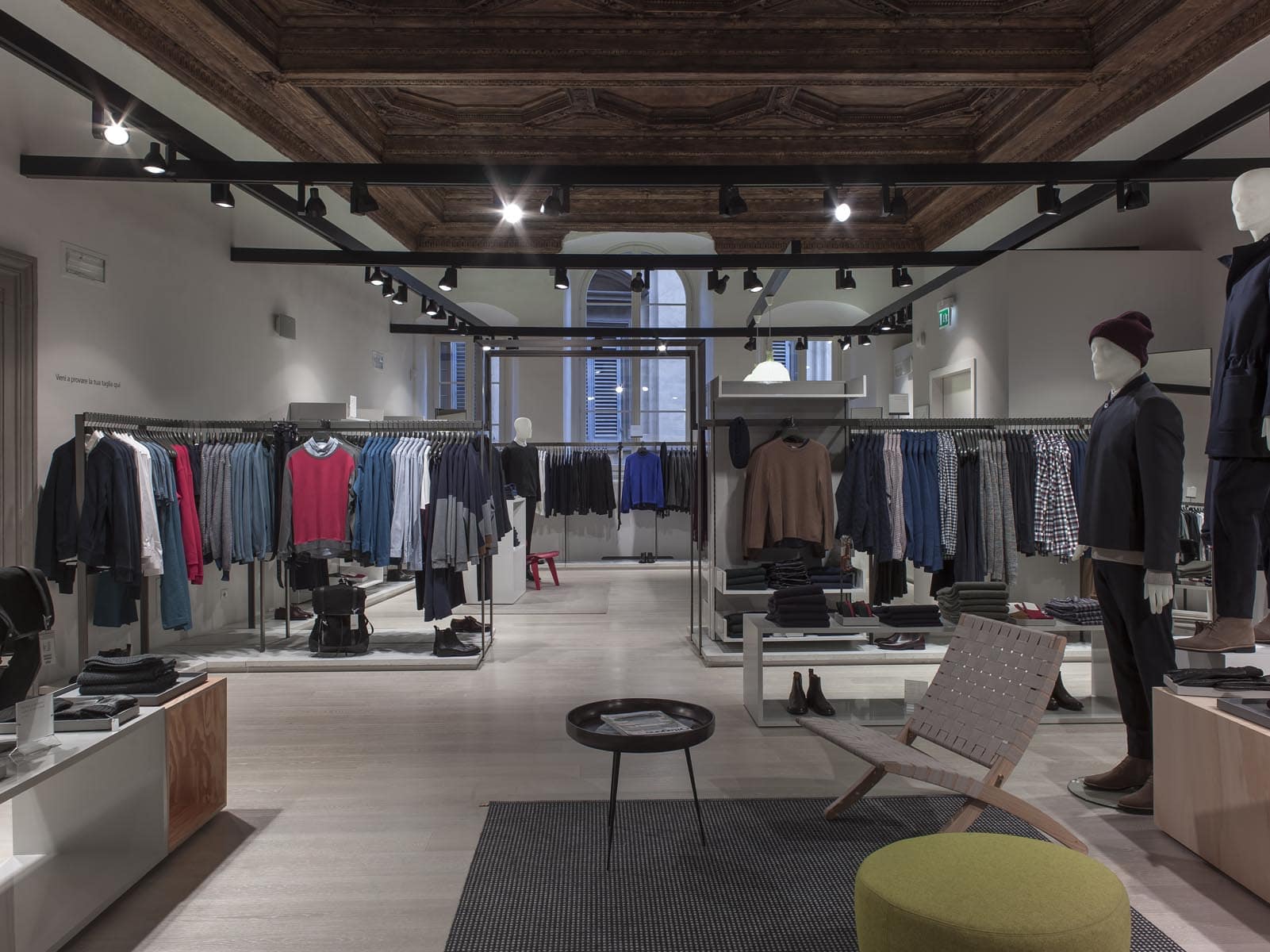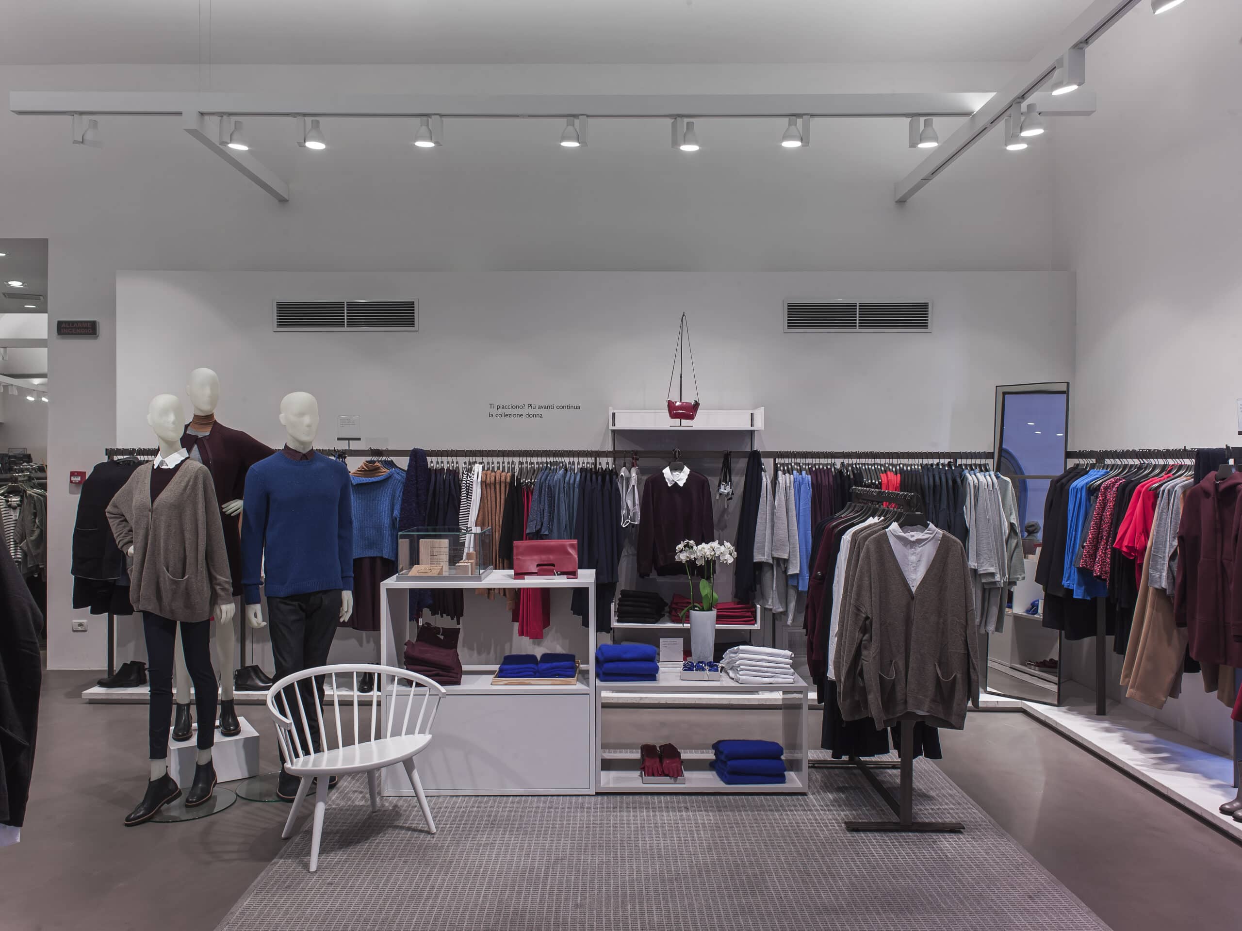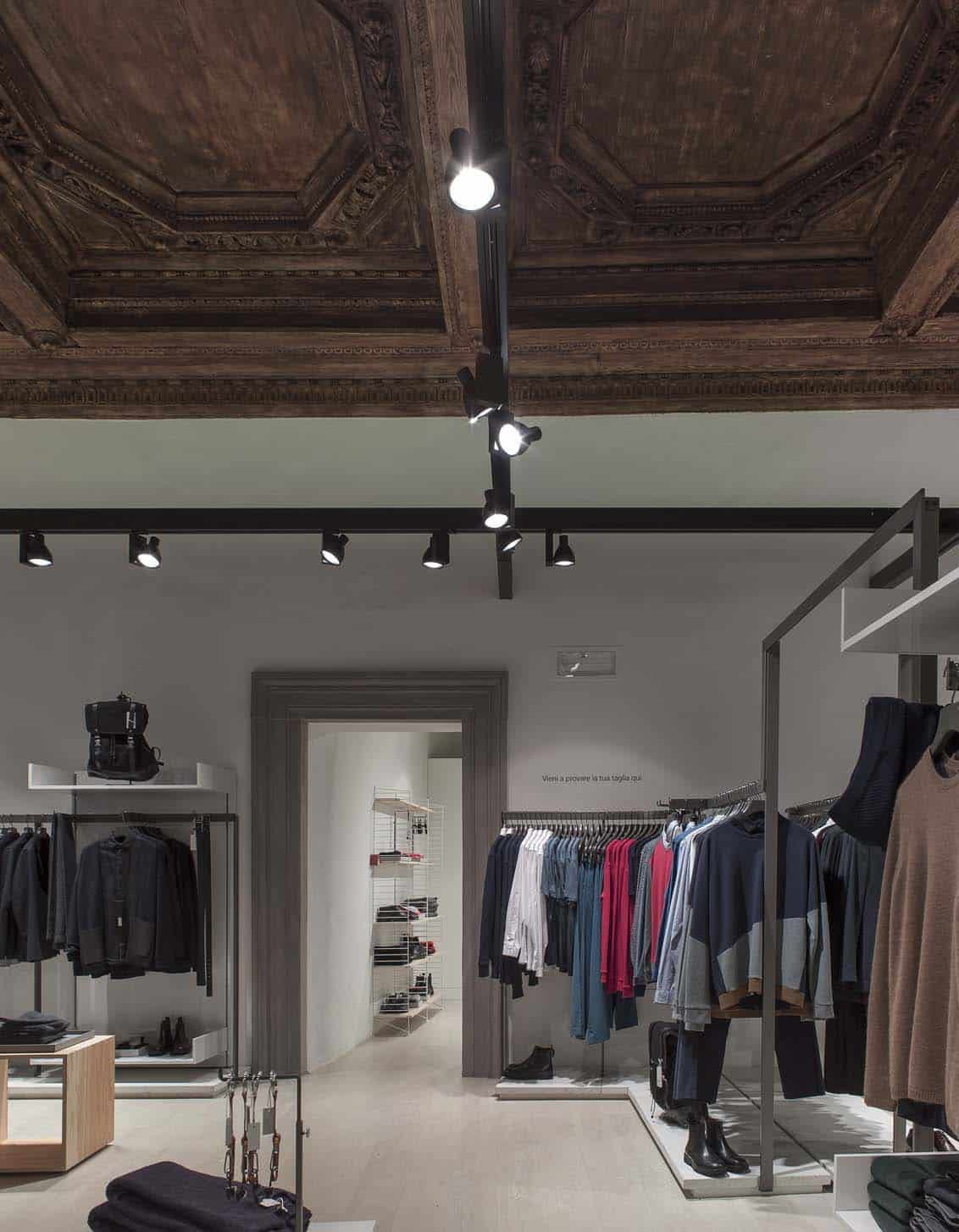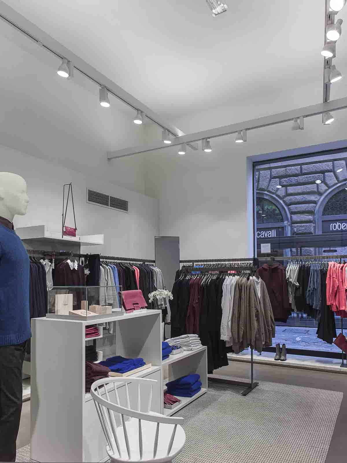 Con barre di lunghezza fino a 18mt totalmente prive di sospensioni si è ottenuto l’ottimo risultato voluto: illuminazione con proiettori a binario, illuminazione indiretta con un sistema a binario pertanto liberamente modificabile, ma totalmente privo di sospensioni.In riferimento alle diverse aree merceologiche del negozio lo studio Sgargi ha optato per due diversi colori del