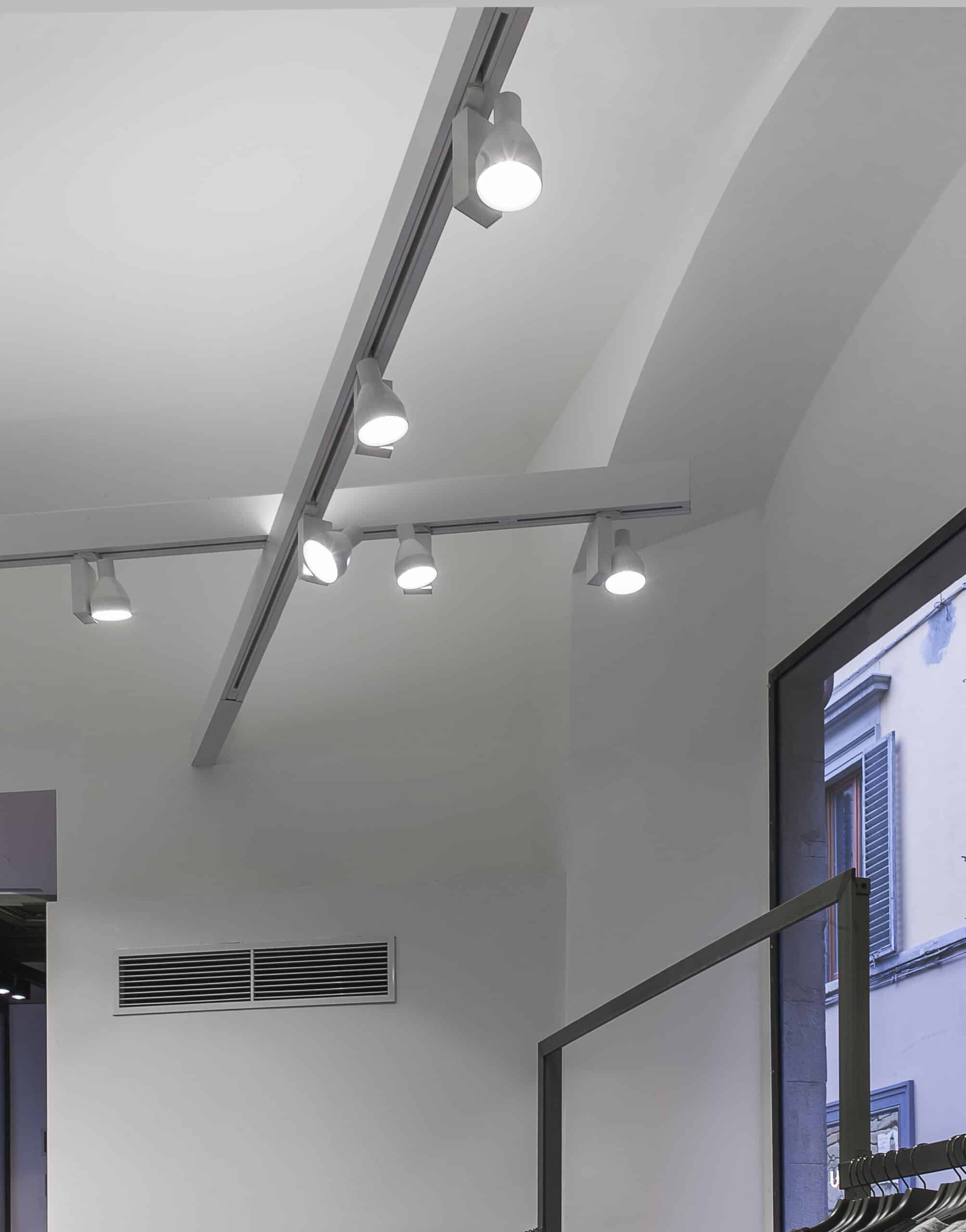 soffitti. La soluzione era quella di creare delle strutture autoportanti con fissaggio strutturale alle sole pareti: una sorta di trave sul quale installare i proiettori orientabili tipici dei negozi di abbigliamento.  Si è riusciti, partendo da un prodotto “commerciale”, a trovare la perfetta soluzione alle esigenze di cui sopra, un sistema illuminante lineare totalmente privo di sospensioni o pendinature. Il sistema FILE 2 H  è costituito da un profilo in alluminio ad H con installato un binario elettrificato nella parte inferiore, a servizio dei proiettori, ed un sistema illuminante fluorescente a fila continua nella