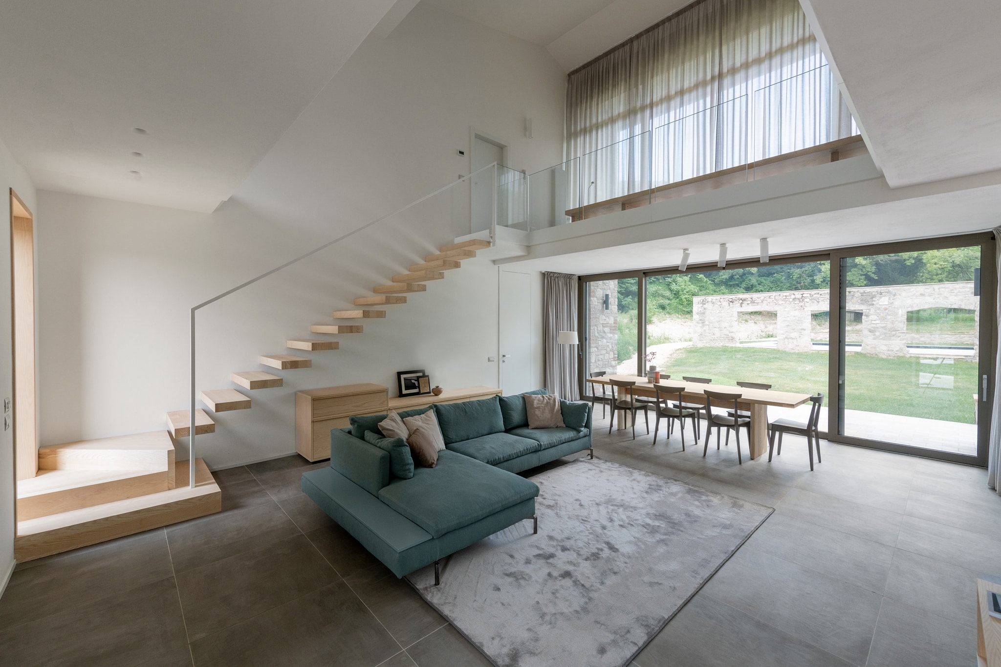 La casa si sviluppa su due piani principali: una zona giorno, camera padronale e servizi ben schermati da porte armadiate al piano terra e un grande piano scrivania con vista sul lotto esterno incorniciato da un ballatoio con affaccio sul salone oltre alle due camere ospiti al piano primo. Tutto collabora a creare un’immagine coordinata elegante e raffinata, messa in evidenza da accenti luminosi e un accurato studio della luce sia interno che esterno. Lo studio del verde, dei percorsi e dell’area retrostante la casa ha seguito la logica teatrale lavorando per quinte e schermi visivi consecutivi. Un progetto complesso in perfetto equilibrio tra la storicità del luogo e lo stile di vita contemporaneo.